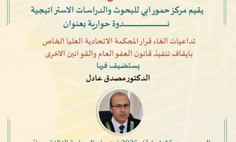 جانب من ندوة مركز حمورابي للبحوث والدراسات الاستراتيجية يوم السبت الموافق 15 شباط 2025 ندوة حوارية تناولت التداعيات القانونية والسياسية لإلغاء قرار المحكمة الاتحادية العليا المتعلق بتعليق تنفيذ قانون العفو العام. شهدت الندوة مشاركة مجموعة من الأكاديميين والمتخصصين في القانون الدستوري، الذين ناقشوا أبعاد هذا القرار وانعكاساته على مختلف المستويات.